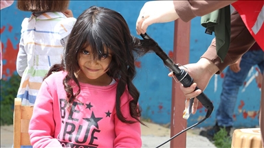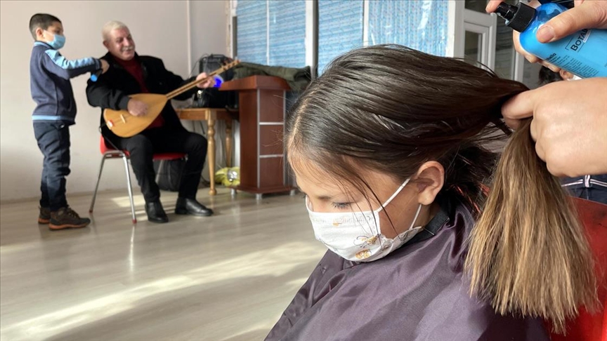 Merkeze bağlı Bayramoğlu köyündeki ilkokul ve ortaokulda öğrenim gören öğrencilerle okulun toplantı salonunda bir araya gelen gönüllüler, bağlama eşliğinde söylenen türkülerle erkeklerin saçlarını tıraş etti, kızların ise saç bakımını yaptı.
