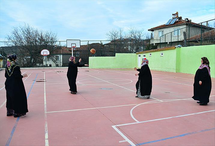 Sabahın erken saatlerinden itibaren hayvanlarına bakan ve işlerini tamamlayan köylü kadınlar, köy meydanındaki spor komplesine giderek, basketbol, voleybol ve tenis oynuyor.