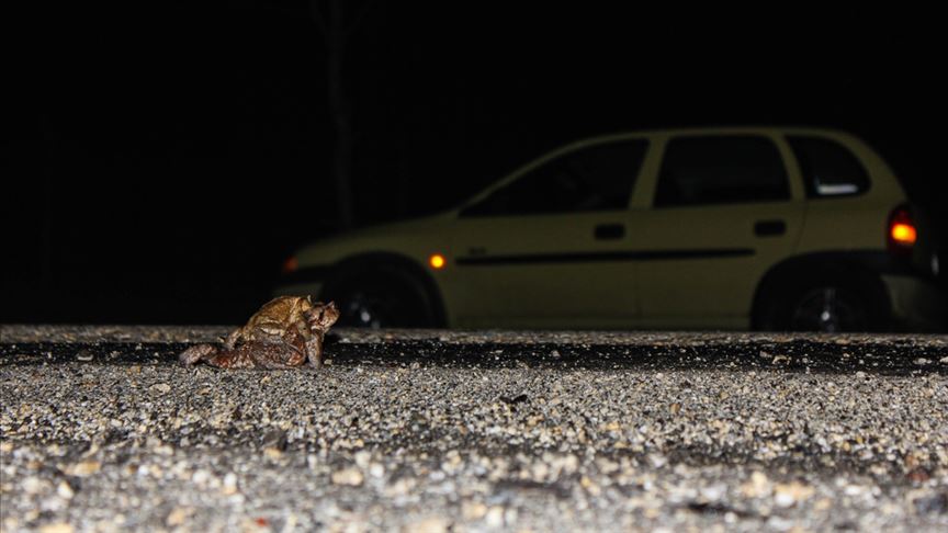 Gece gündüz birbirlerinin sırtında karayolunu geçmeye çalışan kurbağalardan bazıları, araçların altında ezilerek telef oluyor.