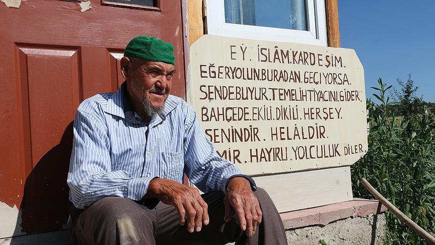 "Bahçeye her gün gelmeye çalışıyorum. Buradaki çardakta ekmek, çay, kahve, şeker, tüp ve mutfak malzemeleri var. Bahçeye gelenlere çay ikram ediyorum. Ben yokken gelenlerin bahçedeki nimetlerden faydalanması için de tabelaya 'Bu bahçede ekili dikili her şey senindir ve helaldir' diye yazı yazdırdım. Yoldan geçenler kendileri çay demleyip içebiliyor. Bahçedeki sebze ve meyvelerden yiyebiliyor. Bunların hepsi helal. Bir yandan da bazı vatandaşlarımız çardağa eksilen malzemeleri fazlasıyla koyuyor. Burada her şey bedava."