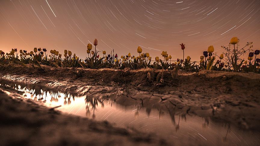 Konya'nın Karatay ilçesi İsmil Mahallesi’nde bulunan lale tarlası gece yıldızlarla birlikte güzel görüntü oluşturdu.
