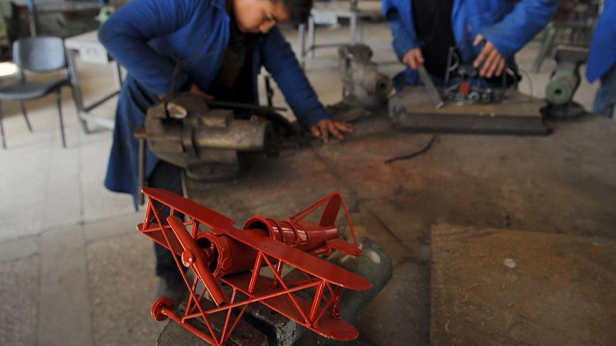 Eğitime katılan 20 öğrenci, kullanılmayan cıvata, somun, sandalye tekerleği ve sac gibi malzemelerden model uçak, otomobil, tank, gemi ve trenin de aralarında bulunduğu oyuncaklar yapıyor.