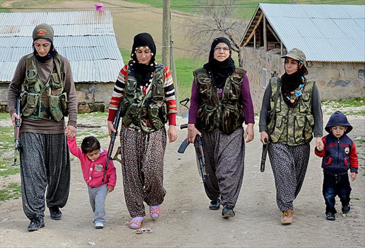 Tunceli'de yaklaşık 25 kadın, bir yandan evde ve tarlada çalışırken, diğer yandan da geçici köy korucusu olarak bin 400 rakımlı mevzilerde ellerinde kalaşnikoflarla köylerini koruyor.