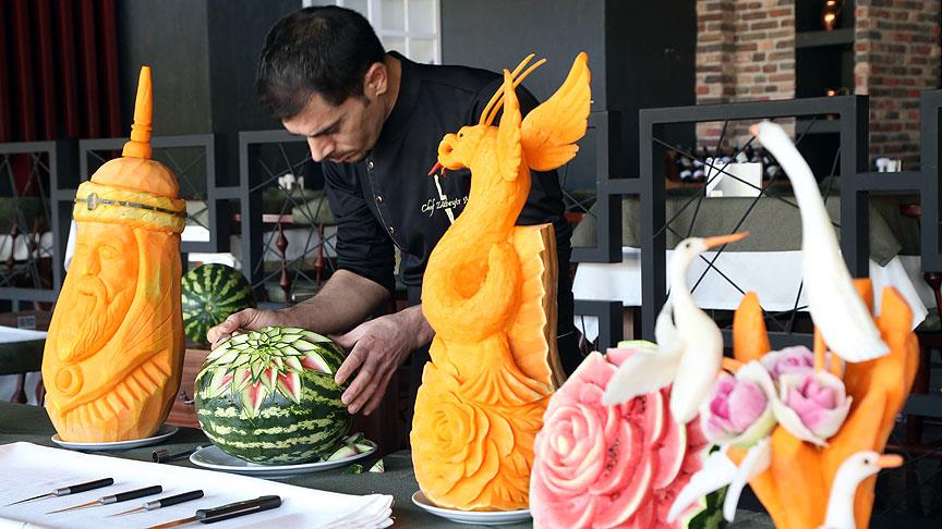 Diyarbakır'da bir restoranda şef olarak çalışan Zübeyir Atlı, karpuz, kabak, turp, havuç, salatalık gibi birçok sebze ve meyveyi ince dokunuşlarla sanat eseri haline getiriyor.
