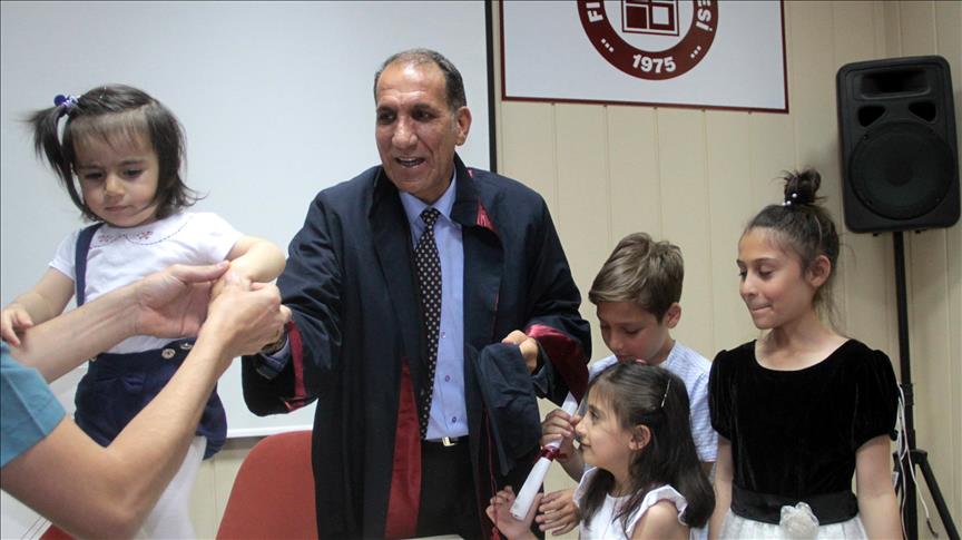 Fırat Üniversitesi (FÜ) Sağlık Bilimleri Fakültesinden mezun olan 56 yaşındaki Ahmet Tosun, sevincini torunlarıyla paylaştı.