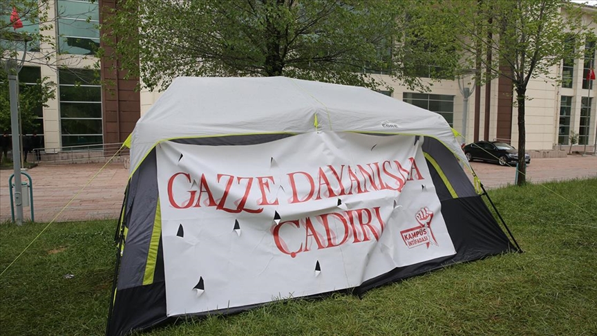 Öğrencilerden Aygül Aslan ise "ABD'deki öğrencilerin eylemlerine destek için biz de burada toplandık. Çadır kurduk. Burada Filistinli kardeşlerimiz için kermes düzenlendi. Her zaman onların arkasındayız. Allah da onların yardımcıları olsun inşallah. Allah, İsrail'in üstüne lanet yağdırsın. Gerçekten onlar çok zalim, çok zulüm yapıyorlar." diye konuştu.