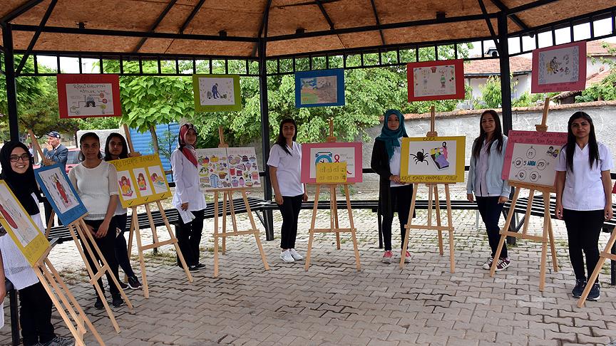 Kırıkkale'de lise öğrencileri, bulaşıcı hastalıklar, obezite, anne ve çocuk sağlığı, tansiyon, şeker hastalığı, kenelerden korunma yolları ve toplumda sıklıkla görülen sağlık sorunları hakkında çizdikleri resimlerle köylüleri bilinçlendirdi.