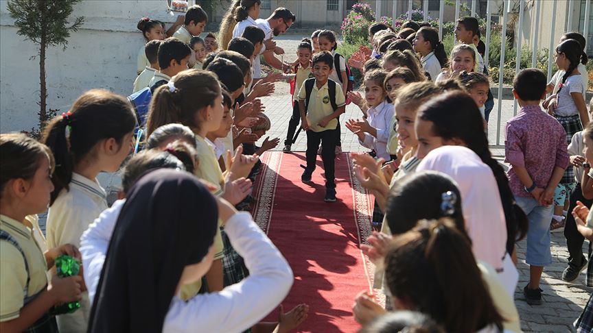 Kaden, kırmızı halıda karşıladığı öğrencilerine iyi dersler diledi, şeker ikram etti.
