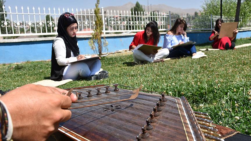 Hakkari'nin Yüksekova ilçesinde görsel sanatlar resim öğretmeni Ümit Bartın, açtığı resim kursunda öğrencilerin ilgisini artırmak ve çalışmalardan yüksek verim almaları için santur (İran-Hindistan kökenli çalgı) eşliğinde ders veriyor.
