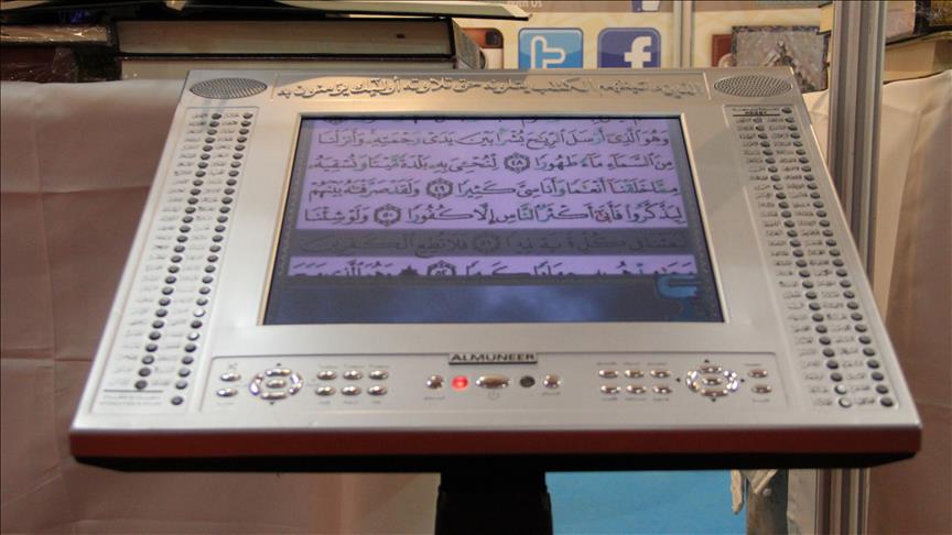 İstanbul Fuar Merkezi'nde düzenlenen fuarda bulunan Dar Al Ma'rıfa Yayınları standında sergilenen rahleli dijital Kur'an-ı Kerim, vatandaşlardan yoğun ilgi görüyor.