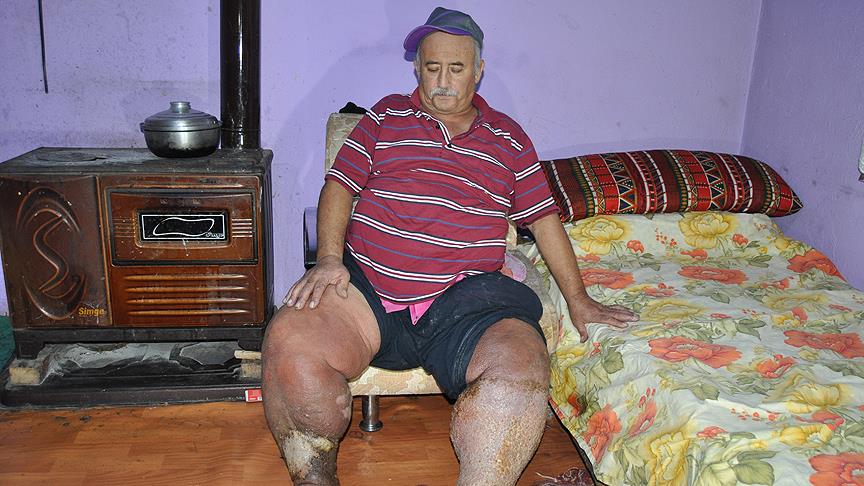 Bartın'da fil hastalığı (lenfödem) nedeniyle ayaklarında ve bacaklarında oluşan şişlikler ve yaralar nedeniyle yatağa bağımlı yaşayan 64 yaşındaki Sabri Reisoğlu, kendisine uzatılacak yardım eliyle sağlığına kavuşmak istiyor.