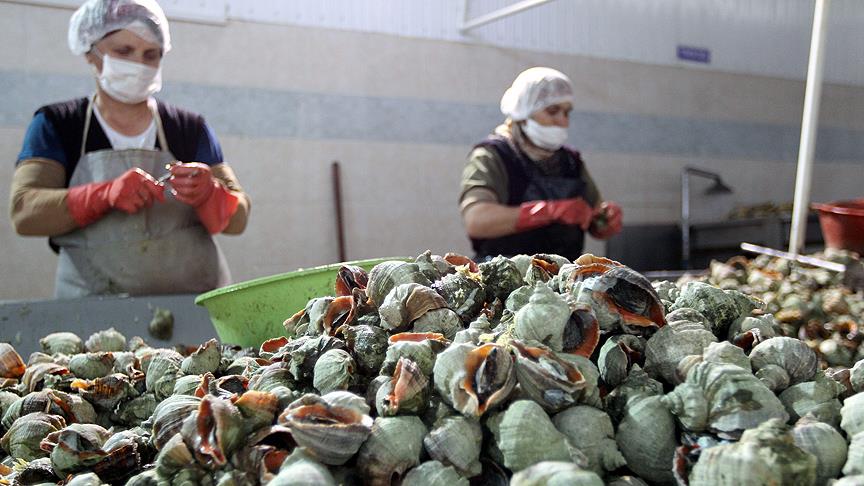 Dalgıçlarca 5 ila 25 metre derinlikten tek tek toplanan deniz salyangozu, fabrikalarda yüksek derecede suda kaynatıldıktan sonra temizleniyor ve eti kabuğundan ayrılıyor.