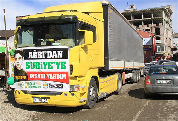Ağrı'da "Sana ihtiyacım var" kampanyası kapsamında toplanan 100 bin liralık yardım malzemesi bulunan tır, Suriye'ye gönderildi.