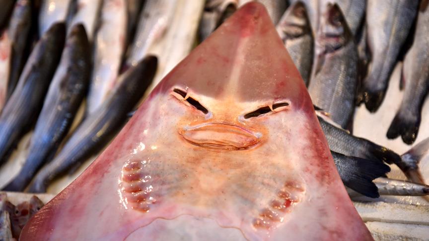 Mersin'de balıkçıların ağına takılan yaklaşık 1,5 metre boyundaki sapan balığı, insan yüzünü andıran görünümüyle balık pazarına gelen müşterilerin ilgi odağı oldu.