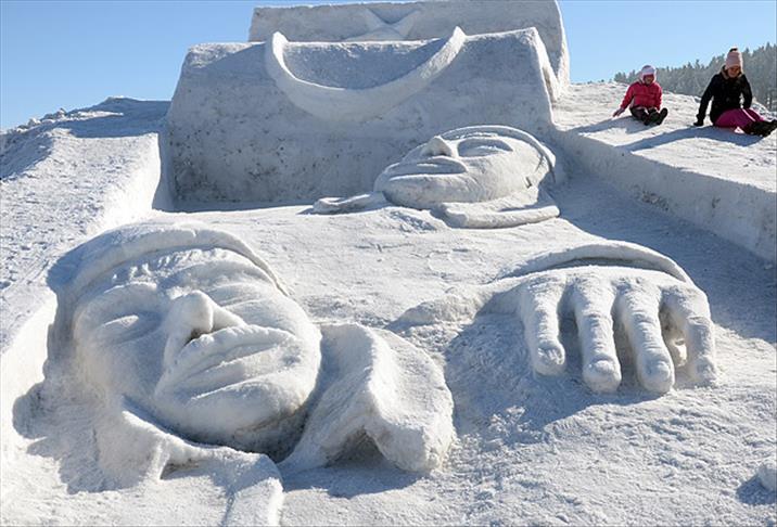 Kayak için Cıbıltepe Kayak Merkezi'ne gelen kayakseverler de 100 kamyon kar kullanılarak oluşturulan kardan şehit heykellerini inceleyerek önlerinde hatıra fotoğraf çektiriyor.