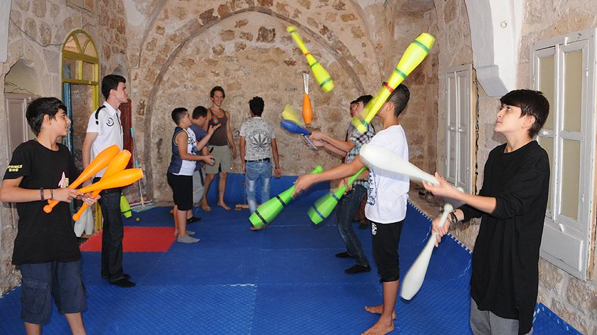 Ülkelerindeki çatışmalardan kaçarak Türkiye'ye sığınan Irak ve Suriye uyruklu çocuk ve gençler, Mardin'de devam ettikleri "sirk okulu"nda acıları unutmaya çalışıyor.