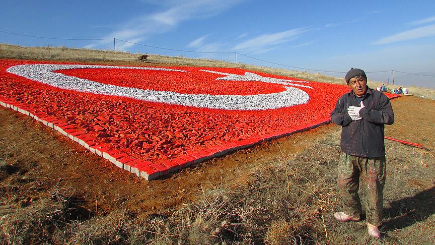 "Dağlıca'nın hemen ardından 15 polisimiz daha şehit olmuştu. Onlar için bir şeyler yapmak istedim. 'Elimden ne gelebilir' diye düşündüm. Sonra bu bayrağı yapmaya karar verdim. Sabah gelip bu bölgeyi tespit ettim. El arabası ve tenekeler ile çevreden taşları toplayıp buraya getirdim. Günlerce uğraştım. Kimseden yardım almadım. Hiç yorulmadım. Allah'ım bana güç verdi, bunu yaptım. Bu bayrağı başta şehit ve gazilerimiz olmak üzere, polislerimize, askerlerimize, Cumhurbaşkanım ve Başbakanıma hediye ediyorum."