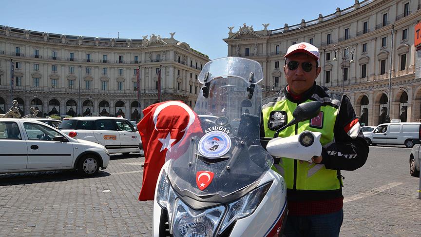 Kayseri’den Avrupa’nın araçla gidilen en uç noktası olan Norveç'in Nordkapp kasabasına uzanan rotanın Roma ayağında AA muhabirine değerlendirmelerde bulunan Mustafa Özdemir, "Son yıllardaki terör olayları sadece şehit ailelerinin ocaklarına değil, tüm Türk milletinin yüreğine düştüğü için terörün dininin, dilinin, ırkının, renginin olmadığını, Avrupa’daki soydaşlarımızla paylaşmak için, bir farkındalık oluşturmak için bu projeyi gerçekleştiriyorum." dedi.