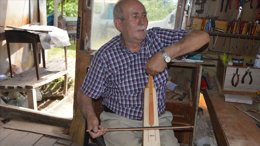 60 yıllık kemençe ustası Şeker Salı, AA muhabirine yaptığı açıklamada, iyi bir kemençenin ardıç ve erik ağaçlarından yapıldığını söyledi.