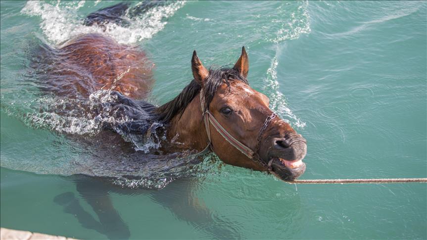 Sıcak havada bunalan atları nehirde serinletiyorlar