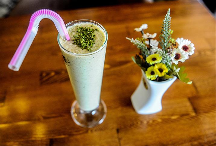 Özcan, ürünün ana malzemesinin şerbet dökülmemiş kuru baklava olduğunu anlatarak, "Bir porsiyon için 3 dilim fıstıklı kuru baklava kullanıyoruz. Yarım yağlı soğuk süt, bir top fıstıklı dondurma, 7-8 buz parçası kullanıyoruz. Üzerine süslemek için toz fıstık atıyoruz" dedi.