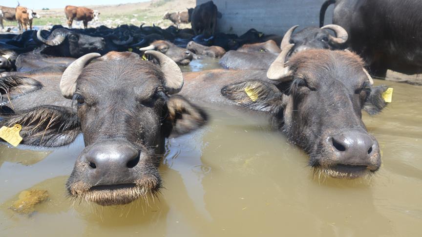 Çoban Hamza Çiftel, gazetecilere yaptığı açıklamada, sıcak havadan etkilenen mandalarını dereye getirdiğini söyledi.