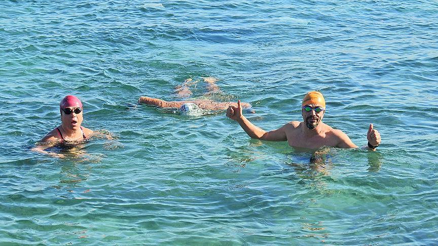 İzmir'de bir grup yüzücü, hava sıcaklığının 4, deniz sıcaklığının 11 derece ölçüldüğü Urla ilçesinde 3 kilometre yüzdü.