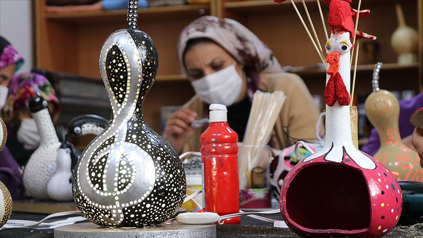 Su kabaklarının farklı şekilde değerlendirilerek dekoratif sanata dönüştürüldüğünü belirten Temiz, ADEM'de okuma yazma ve dikiş nakış kurslarından sonra en fazla rağbetin su kabağı işlemeciliği kursunun gördüğünü aktardı.