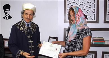 Sultanahmet Camisi'nde görevli Elif Zeynep Yılmaz da her gün öğle ve ikindi vakti yerli ve yabancı turistlere İslamiyet hakkında sunum yapıyor.