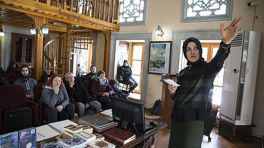 Türkiye'nin ilk kadın cami rehberi Elif Zeynep Yılmaz, Sultanahmet Camisi'nin avlusundaki İslami Bilgilendirme Merkezinde turistlere İslamiyet'i tanıtıyor.