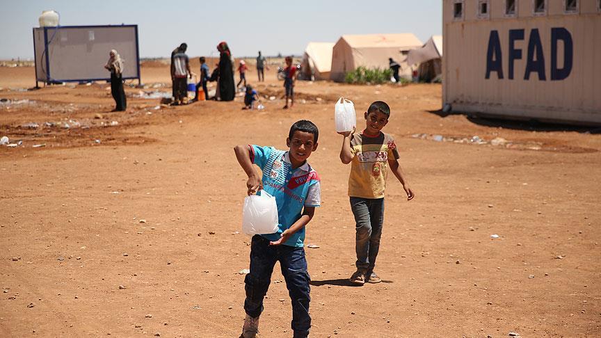 Suriye'de rejim kuşatmasındaki Humus'tan ayrılıp Fırat Kalkanı Harekatı kapsamında teröristlerden temizlenen bölgelere yerleşen Suriyeliler, bölgede 40 dereceyi aşan sıcak havadan etkilenmemek için içme sularını buzlarla serinletiyor.