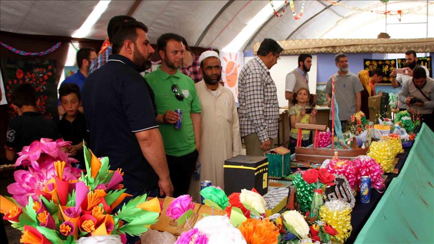 Suriyeli çocuklar, Kabe figürü, hat tablolar, çiçek ve meyve figürleri, şişelerden yapılmış süs eşyaları, mozaik tablolar, minyatür değirmen gibi eserleri sergiliyor.
