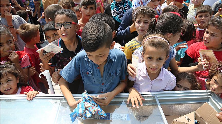 Yaklaşık 8 bin kişinin kaldığı kampın meydanına getirilen toplam 15 bin dondurmayı almak için onlarca çocuk sıraya geçti.