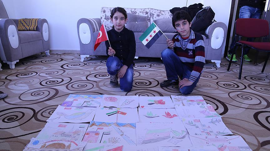 Furkan Geçici Eğitim Merkezi'ne giden 5-13 yaşlarındaki çocuklar, yazdıkları şiir ve hazırladıkları resimlerle, kendilerine kucak açan Türkiye'ye teşekkürlerini iletti.