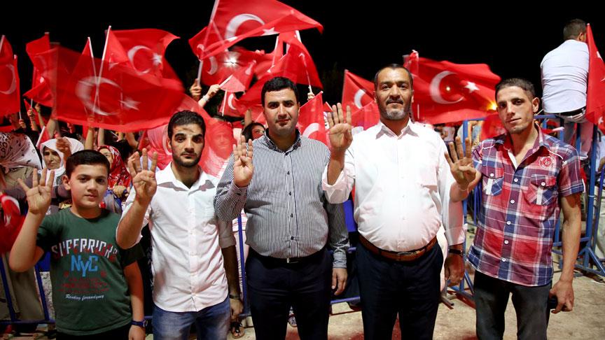 Diyarbakır merkez Kayapınar ilçesindeki Park Orman'da toplanan binlerce vatandaşa destek olmak için gelen ve FETÖ'nün darbe girişimine tepki gösteren Suriyeli vatandaşlar, Türk bayrakları ile Cumhurbaşkanı Recep Tayyip Erdoğan'ın posterlerini taşıdı.