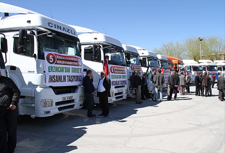 Erzincan'da 40 sivil toplum kuruluşunun iş birliğinde Suriyeliler için toplanan yardım malzemelerinin yüklendiği 15 tır, Hatay ve Kilis'teki sınır kapılarına gitmek üzere hareket etti.