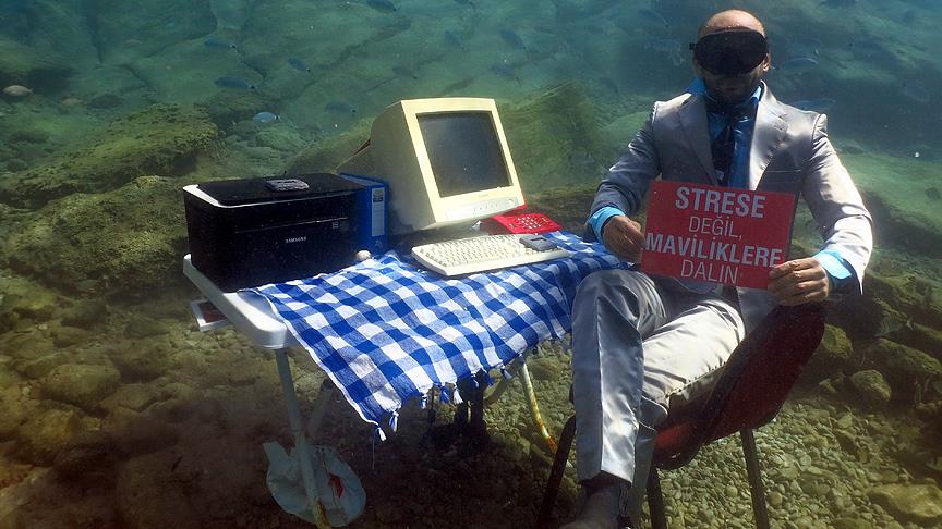 Muğla'nın Fethiye ilçesinde bir dalış okulu, deniz dibinde oluşturduğu ofisle, "Strese değil, maviliklere dalın" mesajı verdi.