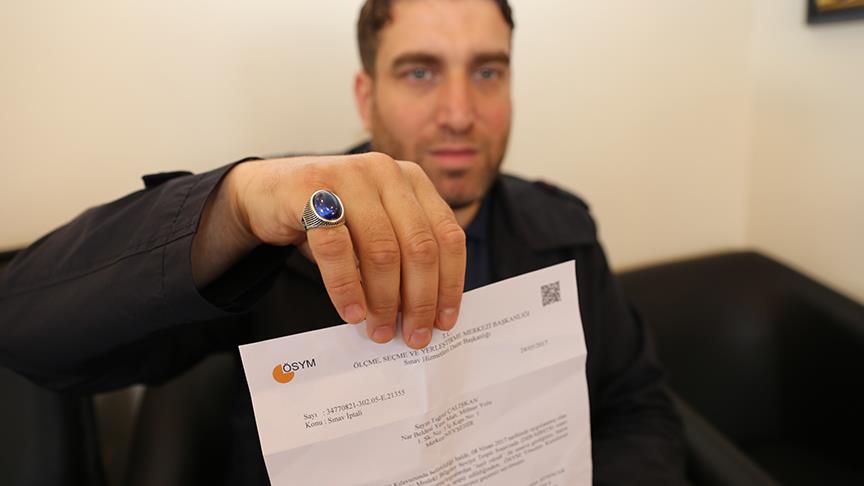 Nevşehir'de yaşayan din görevlisi Çalışkan (36), 8 Nisan'da Kayseri'de Diyanet İşleri Başkanlığı Mesleki Bilgiler Seviye Tespit Sınavı'na katıldı. Heyecanla sınav sonucunu bekleyen Çalışkan'a ÖSYM Sınav Hizmetleri Daire Başkanı Süleyman Şenocak imzalı sınava taşlı yüzükle katıldığı gerekçesiyle sınavının iptal edildiğini belirten belge ulaştı.