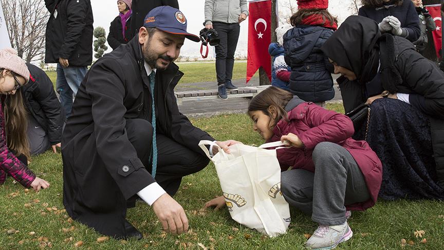Ahmet Aydın ve şenliğe katılan çocuklar daha sonra parktaki meşe ağaçlarından dökülen palamutları topladı. Aydın'a palamut toplarken eşi Zeliha, kızları Elif, Betül ve oğlu Mustafa da eşlik etti.