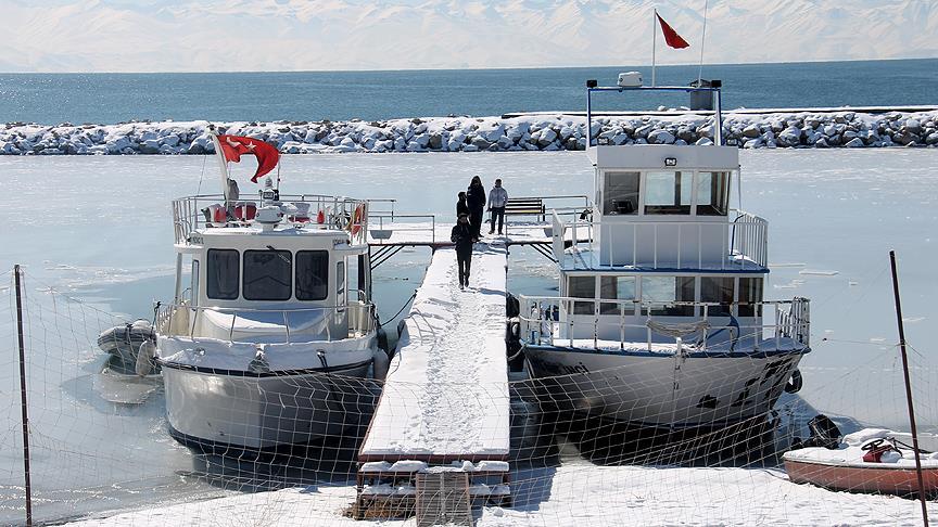 Van Gölü'ndeki Yüzüncü Yıl Üniversitesi marinası, dondurucu soğuk nedeniyle buz tuttu. Marinadaki bazı tekneler, buzlanma nedeniyle hareket ettirilemiyor.