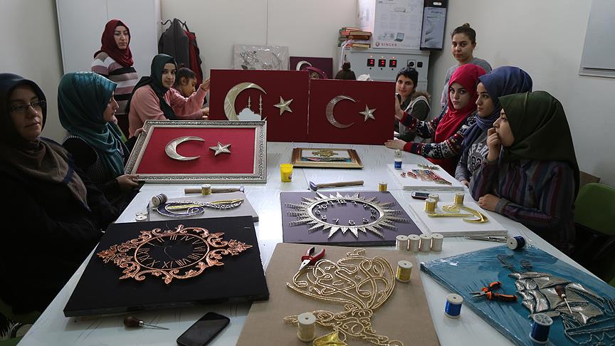 Çivi ve bakır telleri maharetli elleriyle sanat eserine dönüştüren kadın kursiyerler Türk bayraklarına gösterilen ilgiden memnuniyet duyuyor.