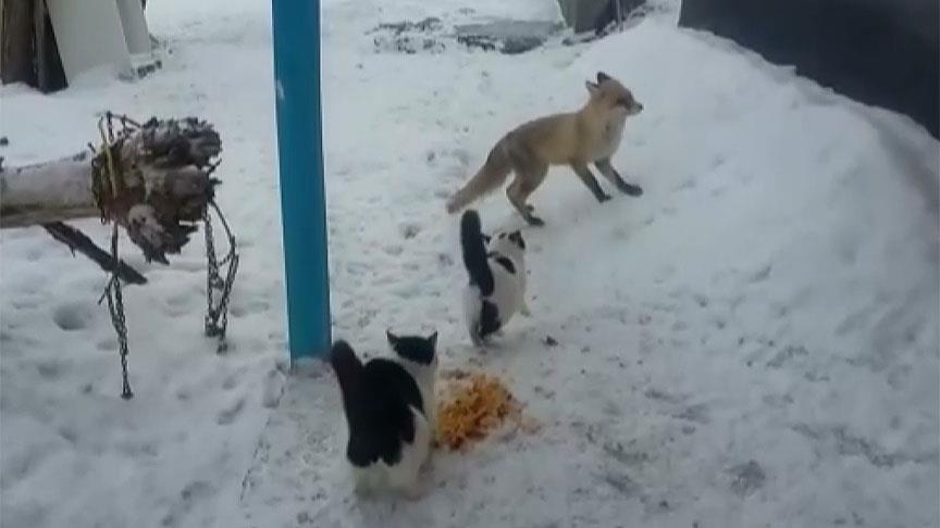Hafik ilçesinde kış şartları nedeniyle yiyecek bulmakta zorluk çeken tilkinin, köy muhtarının evinin bahçesinde kediler ve kazla ekmek kapma mücadelesi görüntülendi.