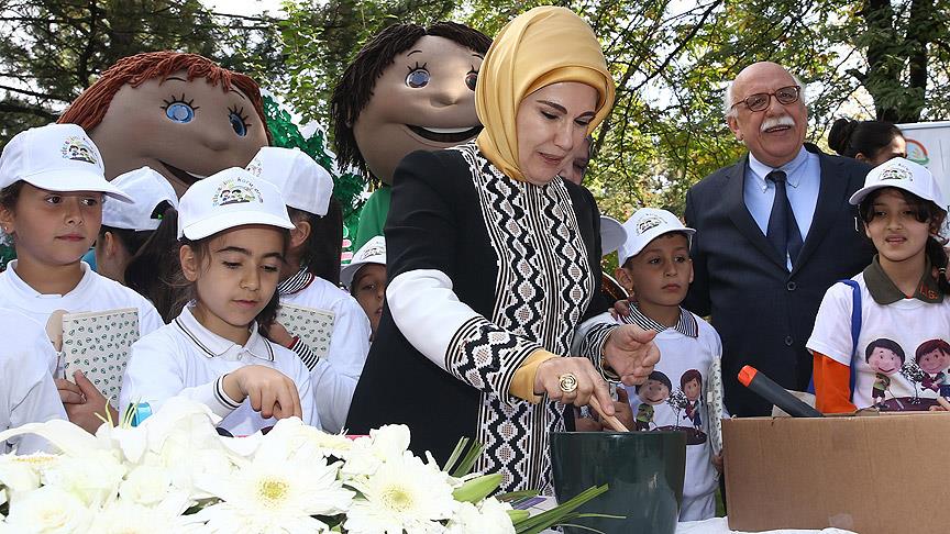 Konuşmaların ardından Emine Erdoğan, öğrenciler ile MEB Şura Salonu'nun bahçesinde saksıya tohum ekti.