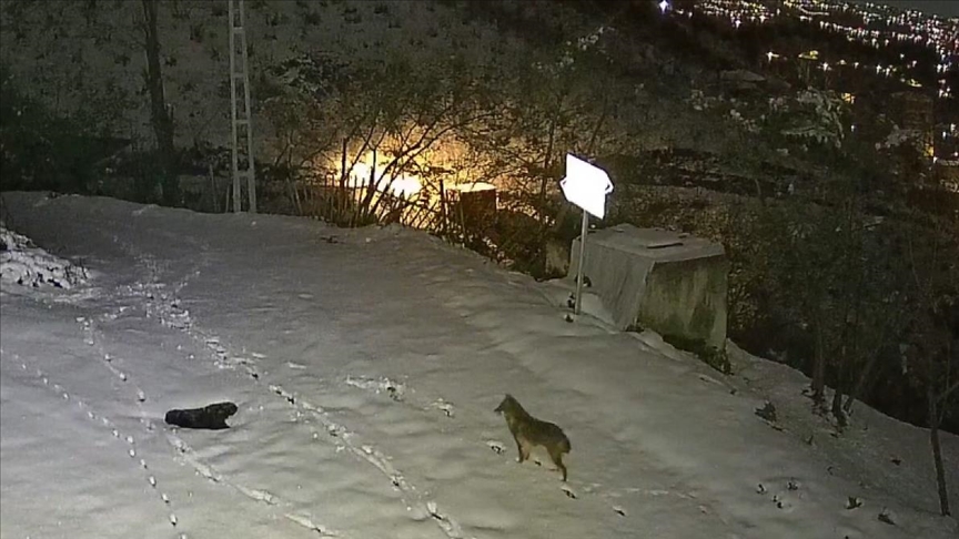 İlçeye bağlı Yenice Mahallesi'nde gezinen kurt ve çakalın yiyecek arayışı güvenlik kameralarına yansıdı.