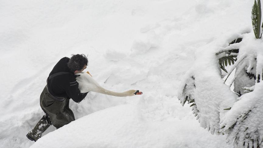Son 60 yılın en fazla karın yağdığı, sahilde ilk kez kar yüksekliğinin 66 santimetre, yüksek kesimlerde ise 1,5-2 metre ölçüldüğü kentte, Zağnos Vadisi Parkı'nda donan göletteki 2 kuğuyu kurtarmaya çalışan belediye çalışanının çabası dikkati çekti.