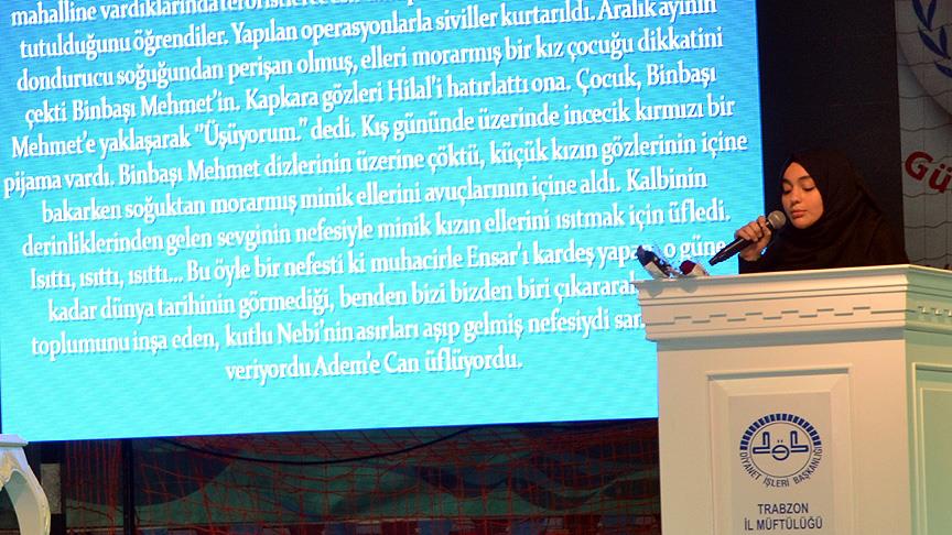 Trabzonlu öğrenci Elif Erbaş, "Kutlu Doğum Haftası" etkinlikleri kapsamında düzenlenen liseler arası kompozisyon yarışmasında kazandığı bin liralık birincilik ödülünü, terör operasyonlarının sürdüğü Şırnak'ın Silopi ilçesindeki çocuklara bağışladı.