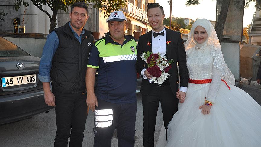 Manisa'nın Soma ilçesinde, trafik uygulaması sırasında düğün konvoyunu durduran Bölge Trafik ekipleri, genç çifti tebrik ederek şeker ikram etti.