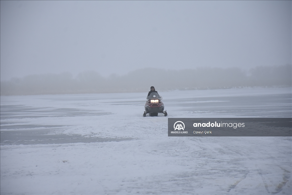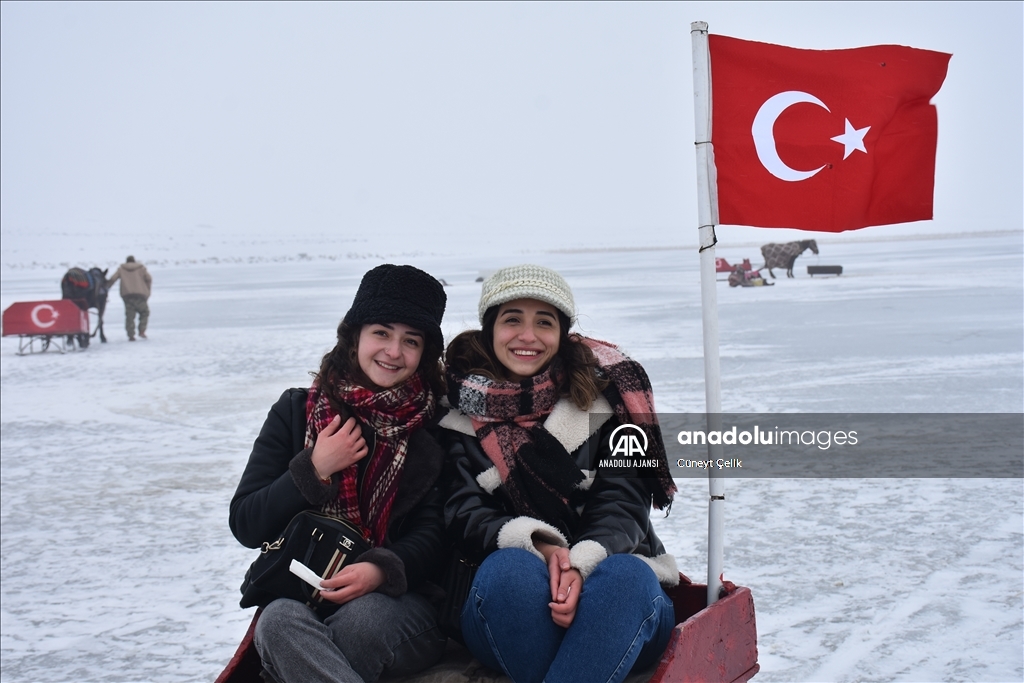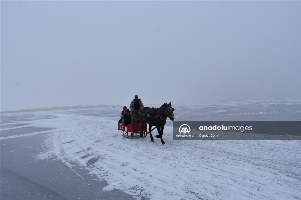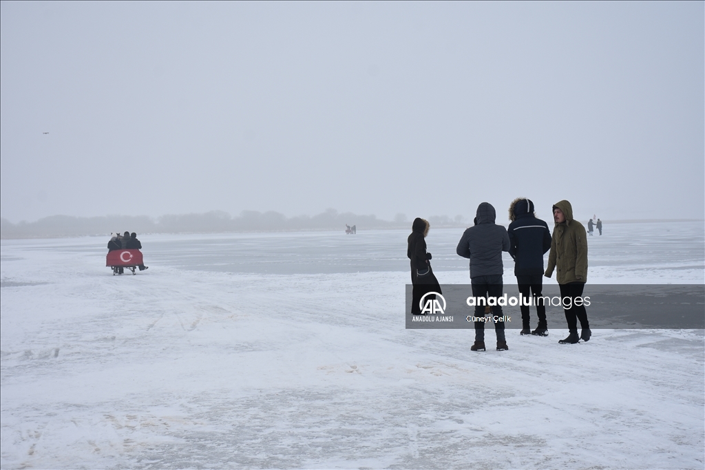 Kış mevsiminde yüzeyi tamamen buzla kaplanan Kars-Ardahan sınırındaki gölün Arpaçay ilçesine bağlı Taşbaşı köyü mevkisi soğuk ve sise rağmen yerli ve yabancı turistleri ağırladı.