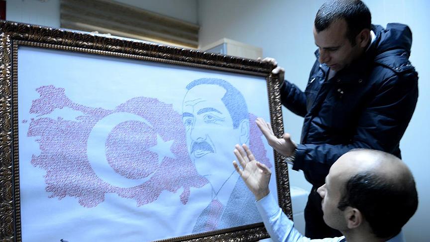Suriyeli mühendis, Arapça hat sanatıyla İstiklal Marşı'nın 3 kıtasını kullanarak Türkiye haritası üzerine bayrak ve Cumhurbaşkanı Erdoğan'ın portresini işledi.