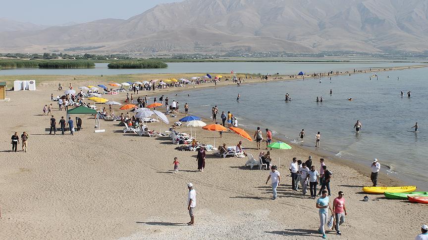 İçişleri Bakanlığınca Kanun Hükmünde Kararname (KHK) ile görevlendirme yapılan Van'ın Edremit Belediyesi tarafından Van Gölü kıyısında oluşturulan halk plajına vatandaşlar yoğun ilgi gösteriyor.